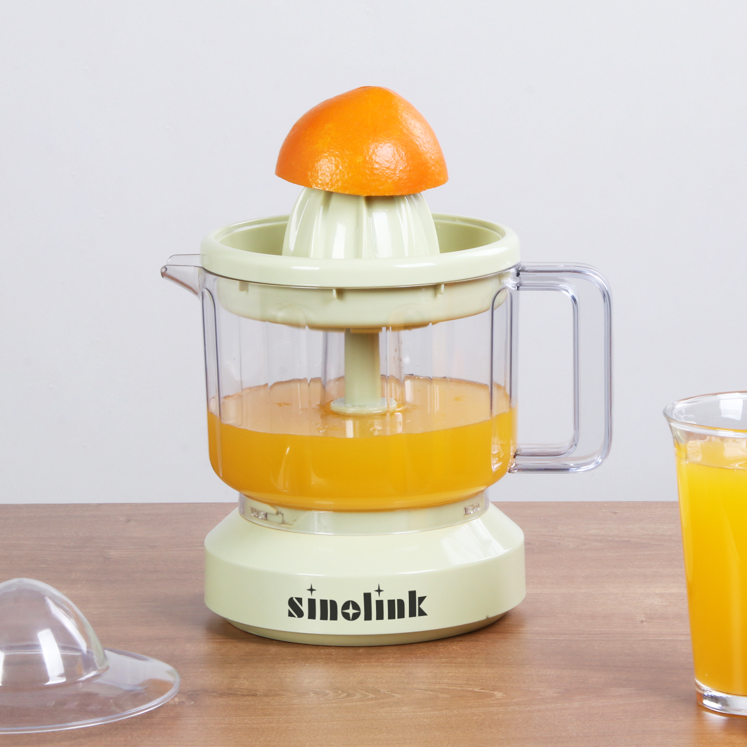 40W electric citrus juicer with 1000ml juice container. Simple structure makes pure and original juice from orange, lemon, lime, grapefruit